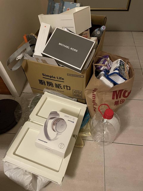 徵求項目:有一箱資源回收+零零散散,大致如圖,頂多加一些空罐。社區有資源回收分類,就把它們好好分類丟掉,如果無法分類的我會給垃圾袋!直接打包丟到社區子母車就好!社區有推車可以借,應該一趟可以完成(?