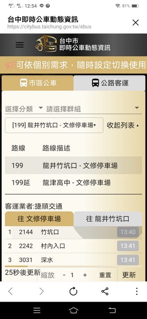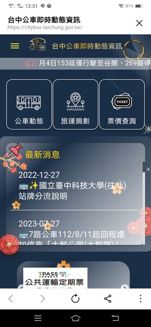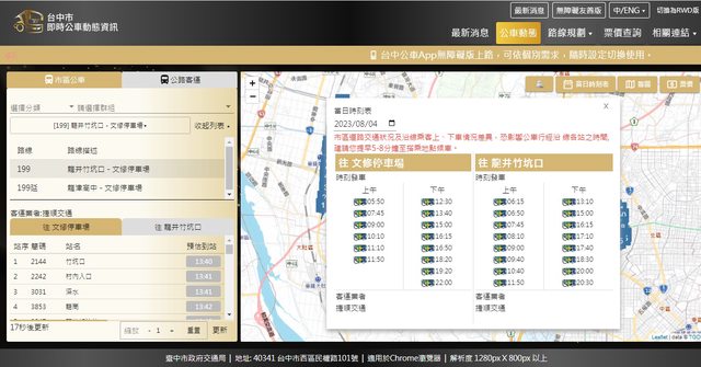 打個比方,如果有人問:哪牌的果汁最純、最健康? 我會回答:能夠的話,建議直接吃水果。 所以說,我會直接建議你用"台中市政府交通局"的網頁版, 我手邊有3款"台中市政府交通局"的網頁版, 想要詳細第一手訊息,最建議第一款,會直接顯示當日最新通阻訊息"今日取消發車資訊"。 ;想陽春型沒附地圖,建議第三款。 1.