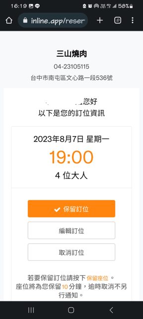 物品名稱:三山燒肉8/7週一 19:00 四人訂位