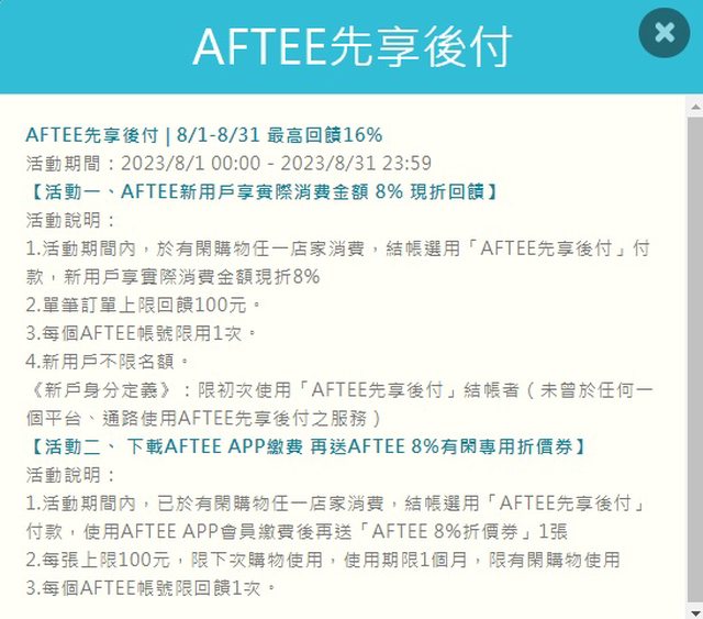 AFTEE先享後付 現折8% 回饋上限100元