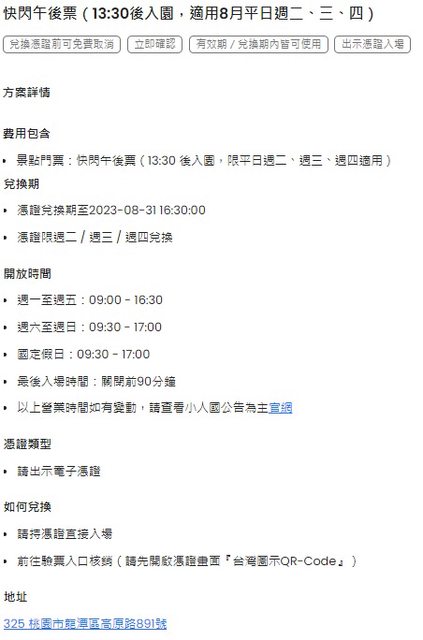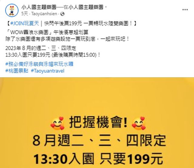2023 年 7~8 月平日(每週二、週三、週四)限定,下午1 點半入園只需 199 元優惠(適用水