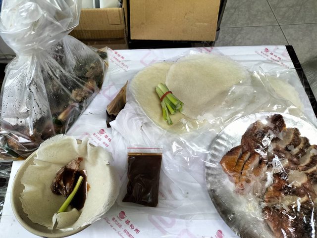 開箱,片鴨+炒鴨架+一包麵皮+一包甜麵醬+蔥=330。我多點一包麵皮+甜麵醬=30。
