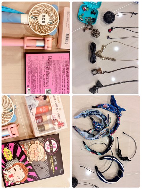 物品名稱:項鍊、髮箍、耳環等配件保養品。自拍棒手持電風扇