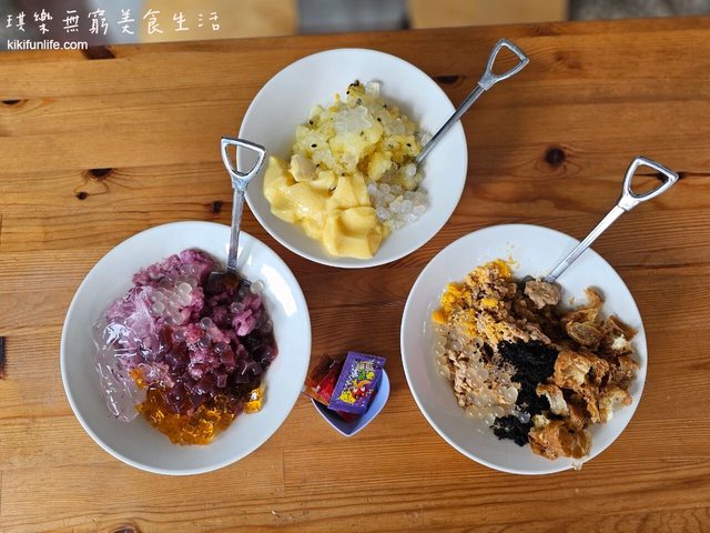 桌上都有提供甘草粉跟玫瑰鹽可以灑。讓一碗冰能有三種不同風味~