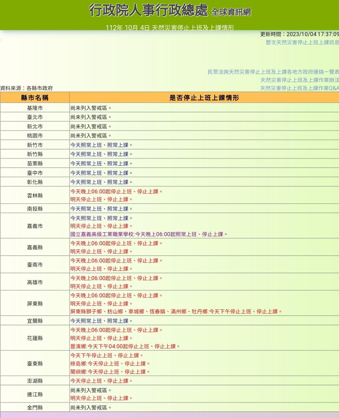 fspmlp : 目前宣布5日停班停課縣市:台南高雄花蓮 10/04 16:15