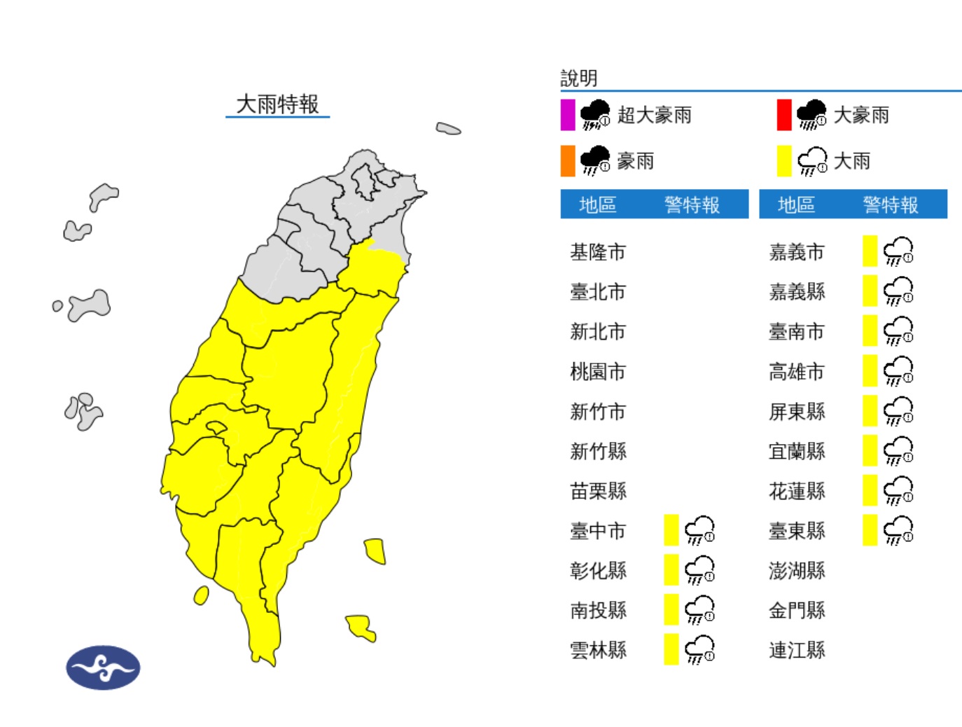 → triplee : 台東跟屏東南部是大豪雨 台中只是大雨特報而已 10/06 16:31