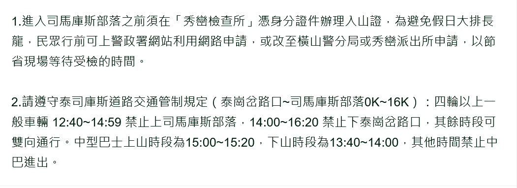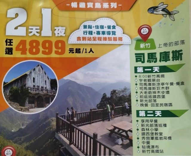[實際揪團] 11/18-19司馬庫斯2天1夜 活動名稱:尋找一起司馬庫斯2天1夜夥伴 活動時間:11/18-19 活動地點:台中高鐵站or新竹高鐵站 活動人數:6人成行(目前只有4人) 還需要2位夥伴(建議熟識朋友同房) 活動費用: 4899+200假日加成 820 台中-新竹高鐵來回 其他說明: Day1 台中高鐵-新竹高鐵(0508 or 0802車次) 08:00熊麻吉旅行社安排行程 https://i.imgur.com/EJRSh1P.jpeg