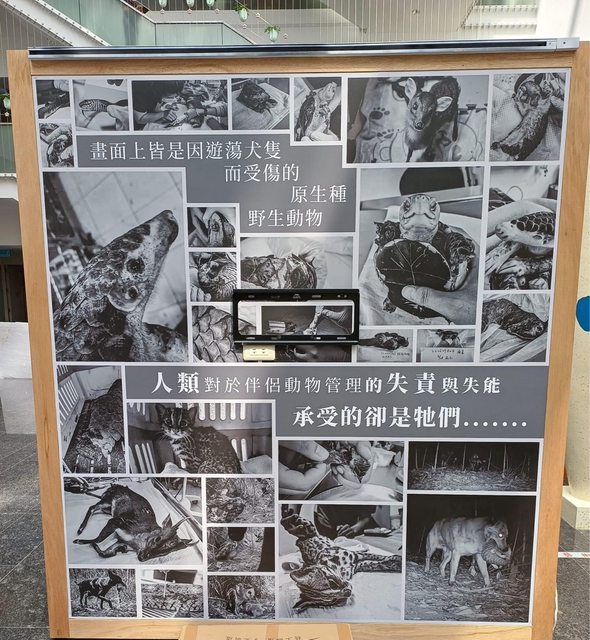 除了犬隻,貓咪在外遊蕩,對野生動物也有危害,從展覽上野生動物急救站提供的數據可