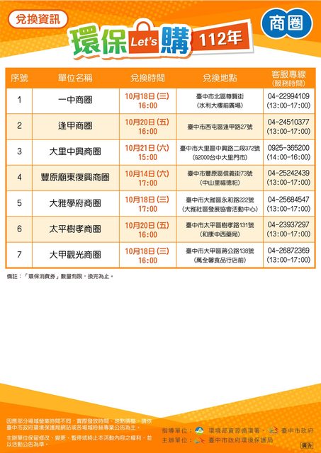 復興商圈、大雅學府商圈、太平樹孝商圈及大甲觀光商圈等18處,每處「環保消費券」兌換