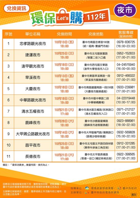 特別提醒~ 本次活動11處夜市及 7 處商圈之「 環保消費券 」兌換日皆不同,務必請詳閱
