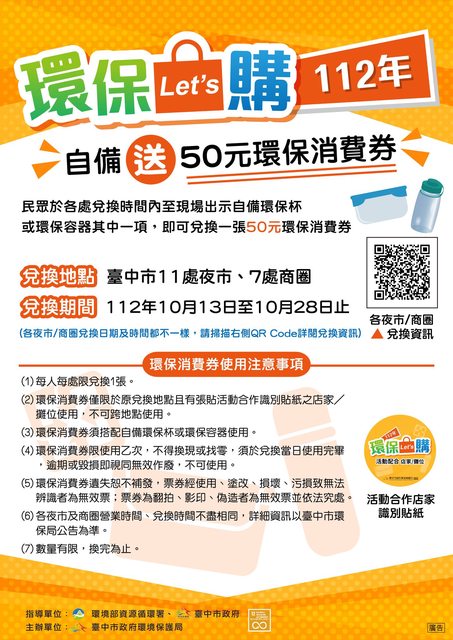 自備環保「金」好康!商圈夜市「環保消費券」兌換活動即將起跑囉,台中市政府環保局為