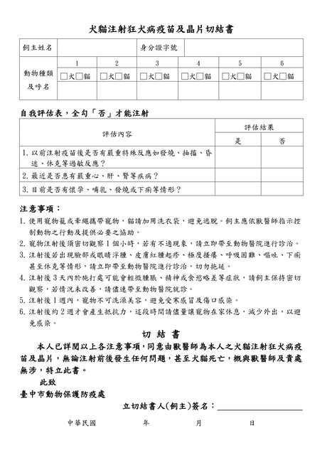 1. 飼主須年滿18歲,戶籍在臺中市,請攜帶身分證件。