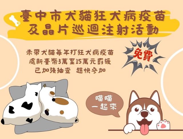 凡設籍臺中市的市民朋友,皆可攜帶身分證及飼養的犬貓前往活動地點免費施打狂犬病疫苗