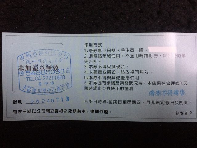 物品:台中清新溫泉飯店 雅緻客房平日住宿券