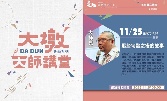 11月大墩大師講堂,將邀請知名作家 大師兄 前來分享經驗,帶大家一窺那些生死、離合背