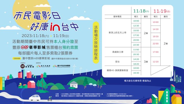 「市民電影日in臺中」將在11月18日至11月19日的周末假日於臺中豐原in89豪華影城舉辦,