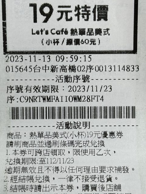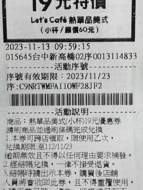 物品名稱:全家單品美式19元優惠券