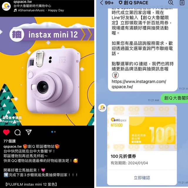 3. 到創Q Space IG底下留言,抽FUJIFILM MINI 12 拍立得(限量兩台)