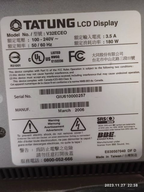 標題[贈送] 大同32"電視