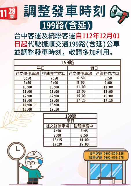 199路(含延)公車自112年12月1日起由台中客運及統聯客運代駛並調整發車時刻