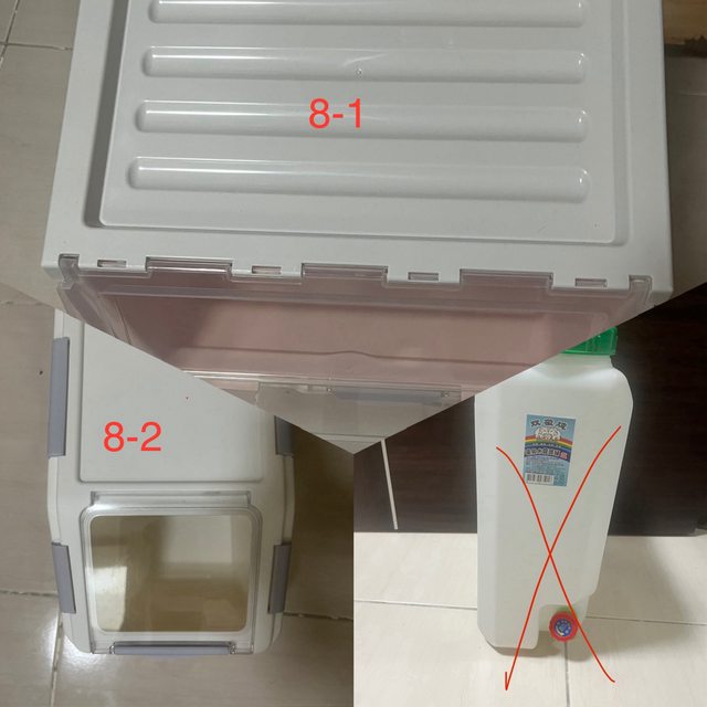 敘述:粉色收納箱的蓋子微微下凹;水桶只有儲存過過濾水,已用酒精消毒。來信時請告
