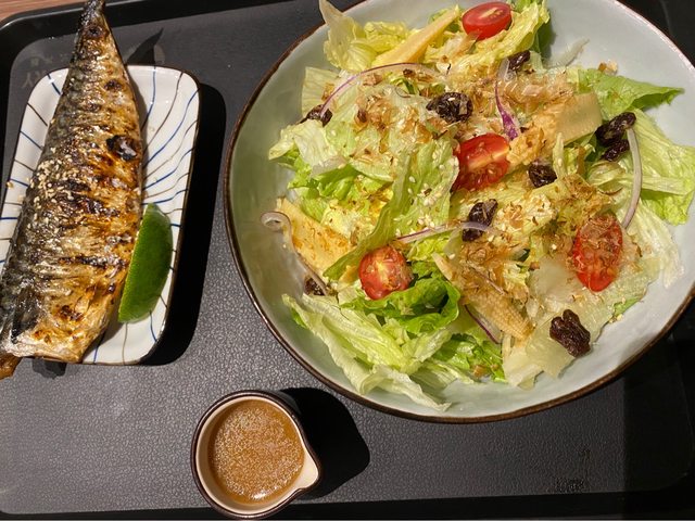 鹽烤鯖魚沙拉,沙拉與鯖魚是分開盛裝的,