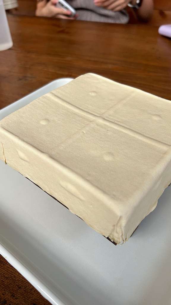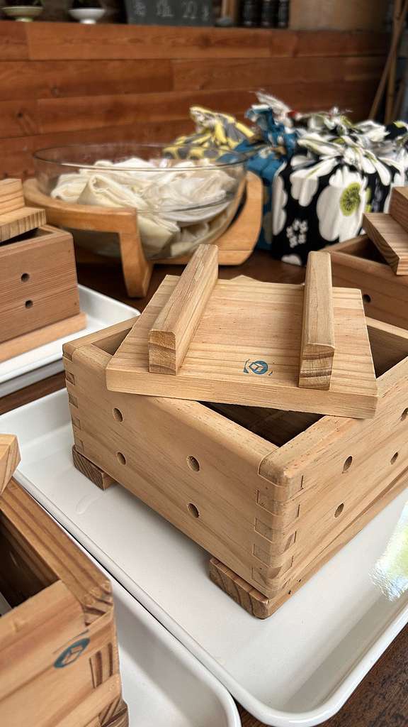 倒入模具=>品嘗小份量實作完成的豆花=>脫模=>品嘗完成的板豆腐