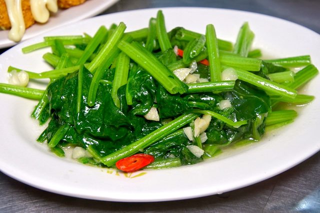 炒青菜(菠菜),菠菜本體仍然保持著鮮綠色,吃起來非常清爽,口感也相當清脆。