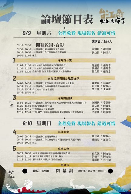 活動將分兩天舉行,首(9)日活動由湯錦台主講「閩南冒險家入台初始」、劉益昌主講