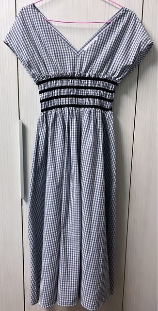 7. V領包肩鬆餅格紋洋裝-藍粉,售350