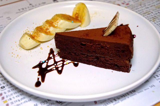 經典全套餐的甜點是巧克力蛋糕佐香蕉片,蛋糕中的巧克力比例很高,吃起來相當濃郁,