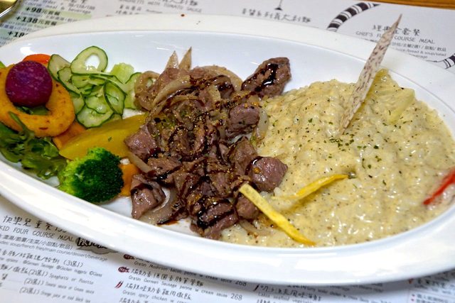 蒜香紅酒骰子牛佐黑松露燉飯,紅酒醃製的骰子牛肉為主菜,加入了蒜香來提味,搭配黑