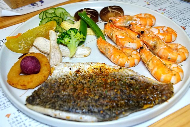 烤鮮蝦鱸魚排,經典全套餐之一,該有的食材已經在菜名上全部打了出來。吃起幾乎沒有