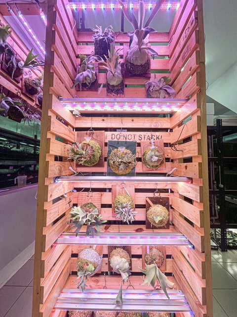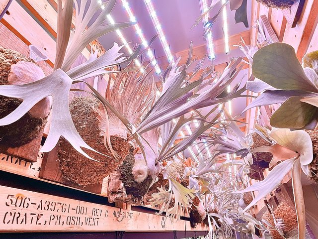 !琳琅滿目各式型態的鹿角蕨在光線的照射下非常搶眼,循著粉紅色的燈光就能馬上找到