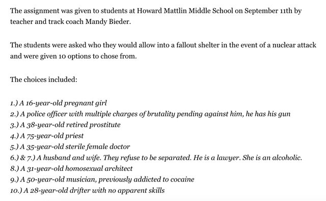 昨天看到美國有個高中出題,說要是發生核災、避難所人數有限制,你需要從中選出可以