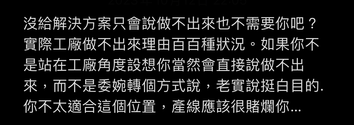 推 maliya : 你跟業務說工廠做不出來,業務不可 27.247.34.90 10/13 12:16
