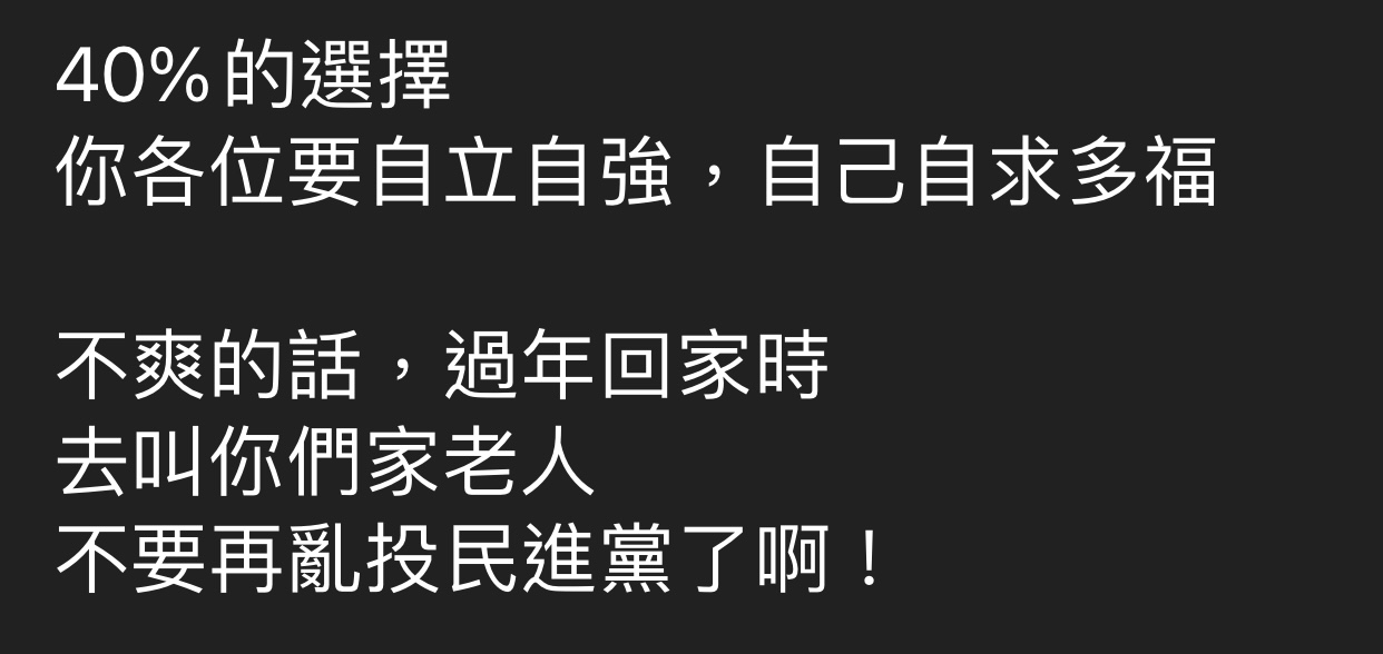 → lip335513 : 40%希望台灣人死光光 正在努力 101.9.197.134 02/08 11:24