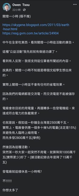 : 看了覺得挺驚訝的,從小學到時候就聽說過這活動,沒想到這個活動實際上對於省電根本沒有幫助,只是單純做秀用的而已