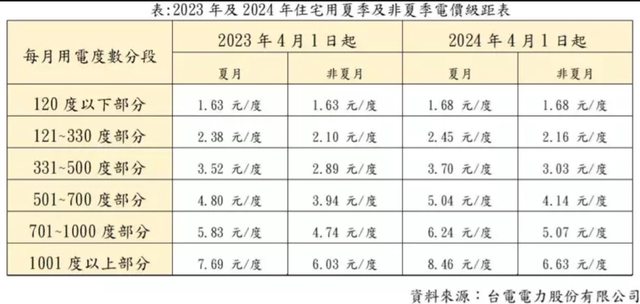 台電4月1日起夏季電費最高級距金額每度7.69元調漲至8.46元,非夏季每度6.03元調漲至