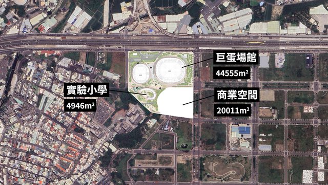 照建物的不同,又分成4萬4555平方公尺的巨蛋場館,4946平方公尺的實驗小學,以及2萬00