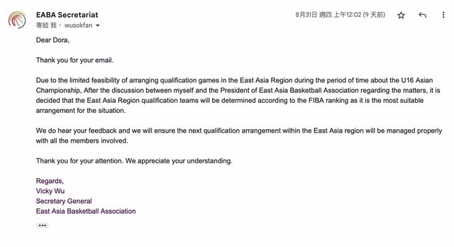 → sissyfox : 亞洲籃總按參賽辦法減東亞一個名額 且按過去東亞 09/09 18:52