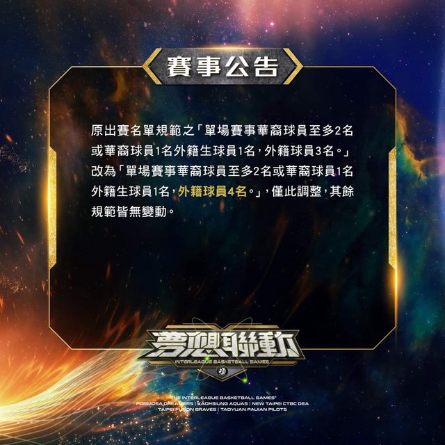 原出賽名單規範之「單場賽事華裔球員至多2名或華裔球員1名外籍生球員1名,外籍球員3名