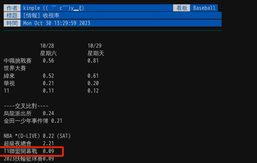 推 booker56 : 拜託,同時間遇到中職ts影響很大好嗎,t1也和中職ts 11/13 16:03
