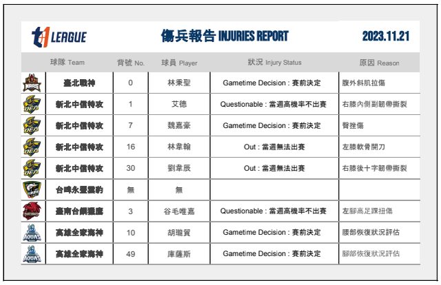 推 joejoe14758 : 純推傷兵名單 11/21 21:16