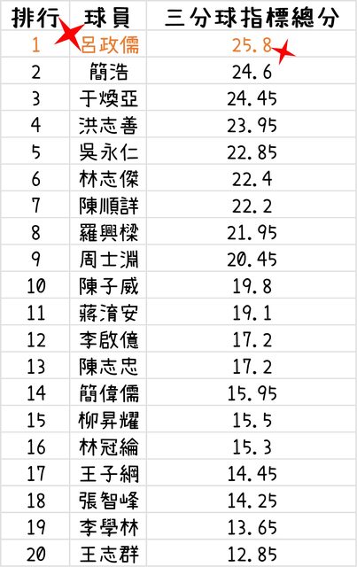 : 25.8分獲得排行榜第一名。希望呂政儒早日康復,延續射手生涯。緊接在後的是簡浩、