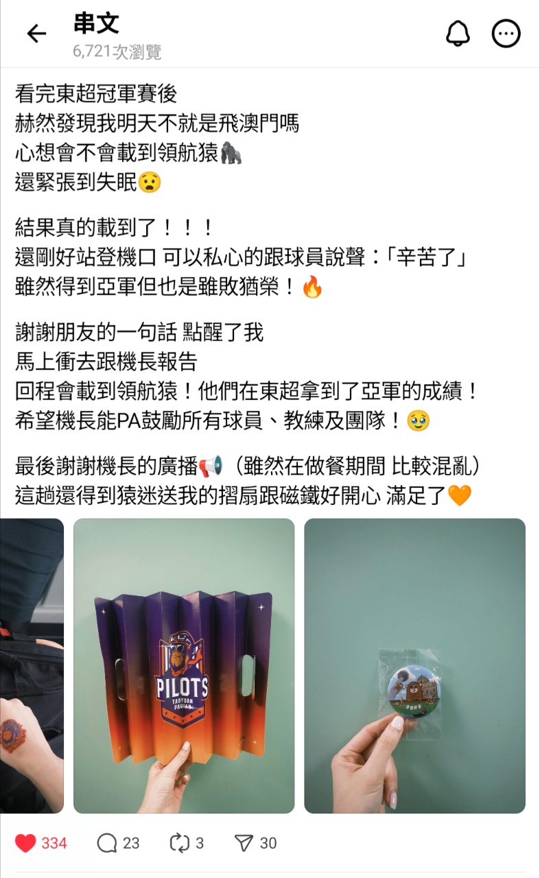 推 walker : threads上看到是猿迷空姐去跟機長說請機長鼓勵的 03/10 17:30
