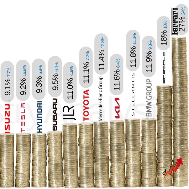 全球汽車製造商每銷售一輛車的凈利潤正在增加。由於供應鏈的恢復和售價的上漲,12家主