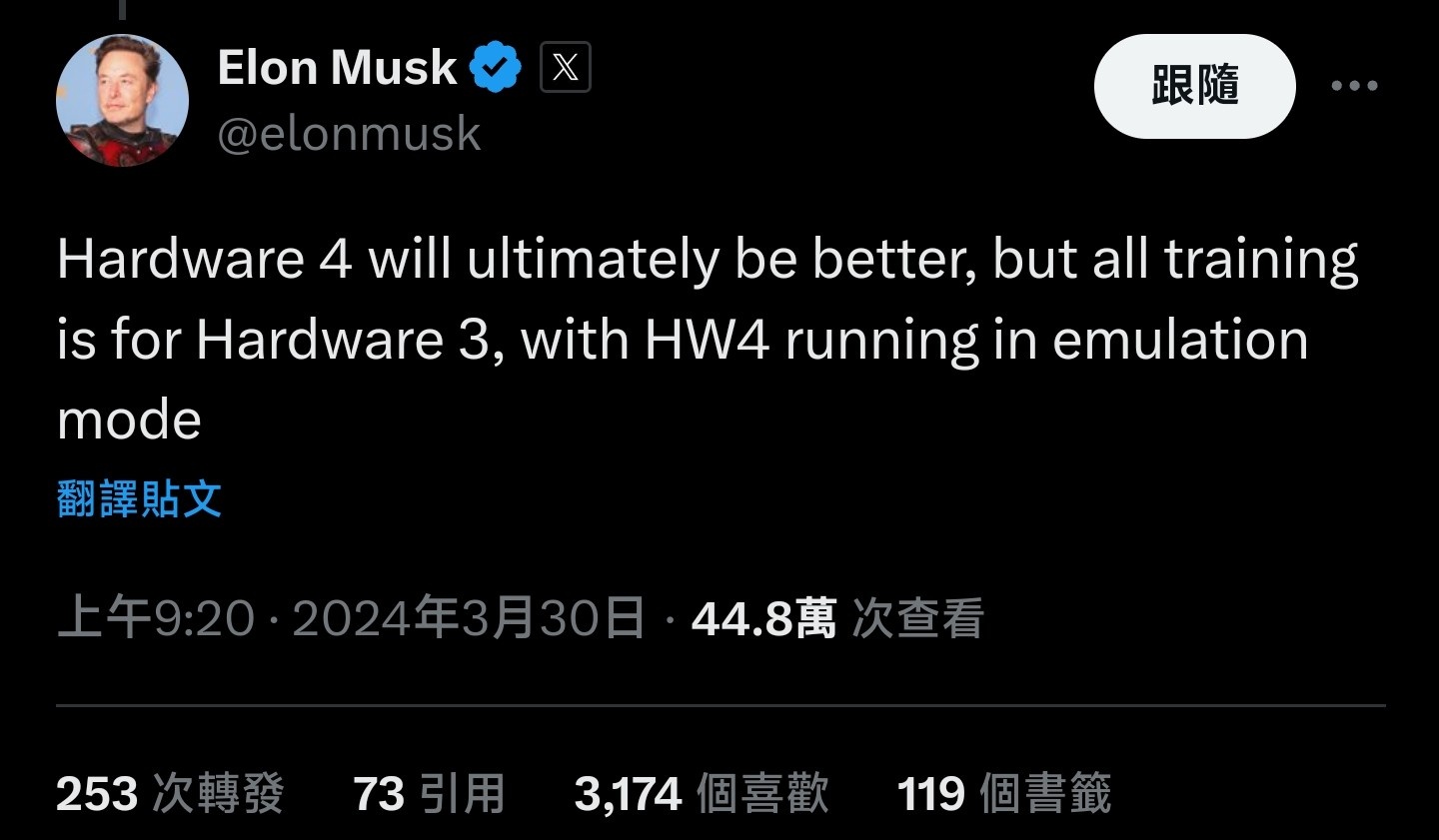 → GOPOL: 沒差....目前都還是以HW3.0為主 何況台灣根本沒開放FSD 07/05 08:54