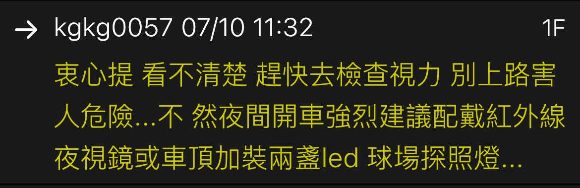 → YMDYMD: 那條路算黑 但我遠遠就有感覺到好像有陰影不一樣就減速了 07/10 12:50