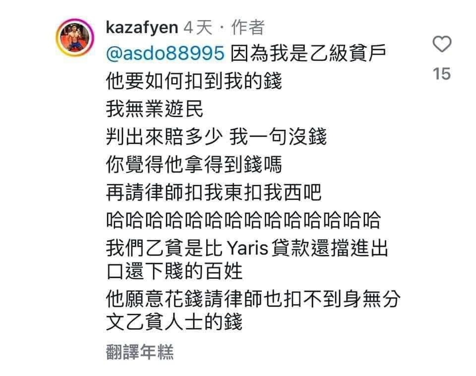 → yesyesyesyes: 這告損毀一定成立阿,在想什麼,名下無產就去蹲牢吧 07/14 13:43
